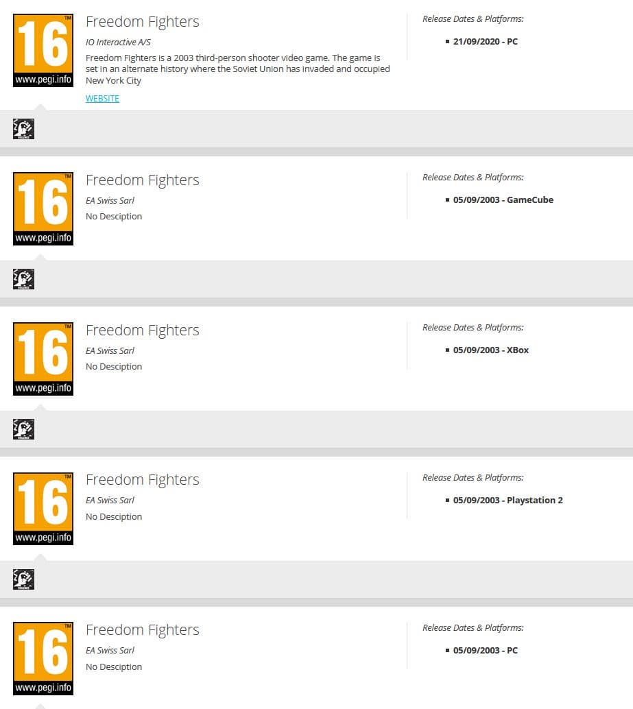 На сайте PEGI появился новый возрастной рейтинг для РС-версии Freedom Fighters. При этом рейтинг оригинала 2003 года выпуска никуда не делся. Рядом с рейтингом новой версии указана дата 21 сентября этого года, но пока никаких анонсов нет. Неизвестно также, получит ли игра обычное переиздание или речь идёт о ремастере либо ремейке.