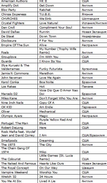 Игра будет включать в себя и творения молодых групп: к примеру, шотландской CHVRCHES, английских Disclosure и The 1975, латиноамериканских Los Rakas и Illya Kuryaki & The Valderramas, американских Robert DeLong, The Colourist и American Authors, а также испанской Crystal Fighters.