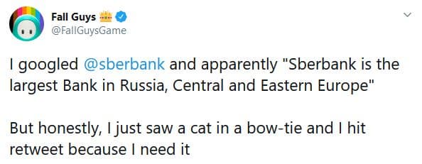 «Поискал в Google «Сбербанк» и, похоже, это самый крупный банк в России, Центральной и Восточной Европе. Говоря откровенно, я просто увидел кота в бабочке и ретвитнул, поскольку мне это нужно»