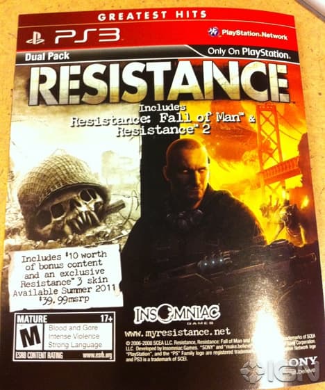 На вкладыше говорится о том, что, помимо двух игр, Resistance Greatest Hits Dual Pack будет включать бонусный контент на сумму $10, а также эксклюзивный скин для использования в Resistance 3.