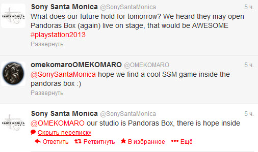 Разработчики пишут, что прямо в ходе презентации может быть вновь «открыта шкатулка Пандоры», а на сообщение читателя, выражающего надежду в то, что речь идет о новой игре, добавляют, что «SCE Santa Monica - это и есть шкатулка Пандоры».