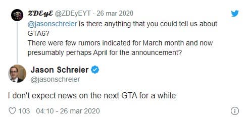 В ответ на одно из сообщений фанатов он написал в твиттере, что в ближайшее время нам не следует надеяться на официальную информацию о новой части знаменитой серии боевиков с открытым миром от студии Rockstar.