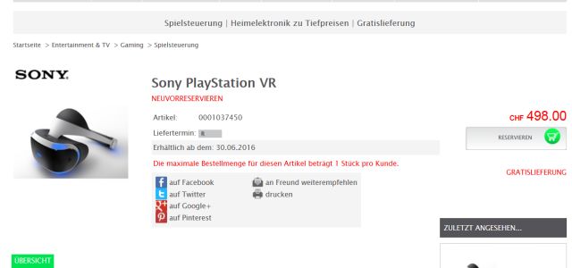 Швейцарский онлайновый магазин Microspot, как и многие другие торговые сети, принимает предзаказы на устройство виртуальной реальности PlayStation VR. Однако Microspot на своём сайте указывает и стоимость устройства равную 498 швейцарским франкам (около 452 долларов). Также, согласно информации торговой сети, поставки PlayStation VR начнутся 30 июня этого года.