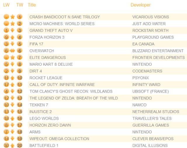 Компания Chart-track опубликовала свежие данные о продажах игр на территории Соединённого королевства. На первом месте расположился сборник Crash Bandicoot N. Sane Trilogy для PS4.