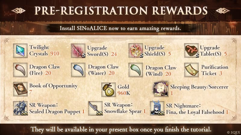 Два миллиона игроков, которые зарегистрировались на участие в SINoALICE получат 14 внутриигровых предметов и 910 Сумеречных Кристаллов. Остальные игроки заработают награды за запуск игры. К примеру, бонусы за вход в первые 10 дней после релиза.