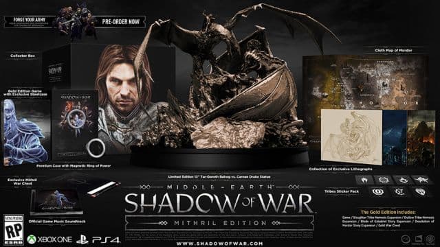 Наконец в продажу поступит специальное «Митриловое» издание (Mithril Edition) за 300 долларов. Оно включает в себя весь контент «Золотого» издания, а также премиальную упаковку с «Кольцом силы», эксклюзивный сундук с внутиигровыми бонусами, диск с саундтреком, карту Мордора, выполненную из ткани, набор стикеров и статуэтку высотой 12 дюймов (примерно 30,5 сантиметров). Статуэтка представляет собой фрагмент сражения двух монстров - Tar-Goroth Balrog и. Carnan Drake.