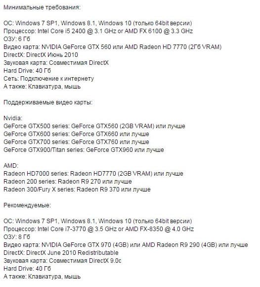 Для запуска игры вам понадобятся процессор Intel Core i5 2400, 6 ГБ оперативной памяти и видеокарта не слабее GeForce GTX 560. В рекомендованных требованиях указаны Intel Core i7-3770, 8 ГБ и GeForce GTX 970.