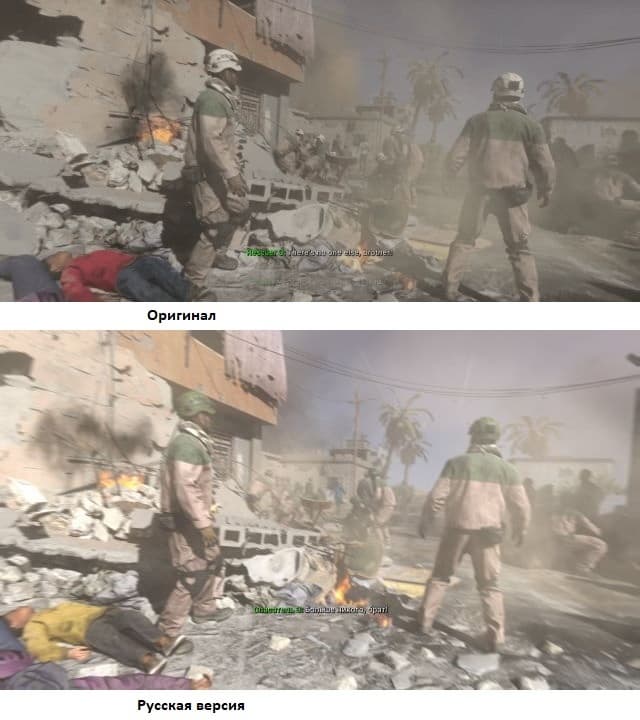 Помимо этого, в субтитрах фраза «русские солдаты» заменена на «люди Баркова». Барков – антагонист игры.