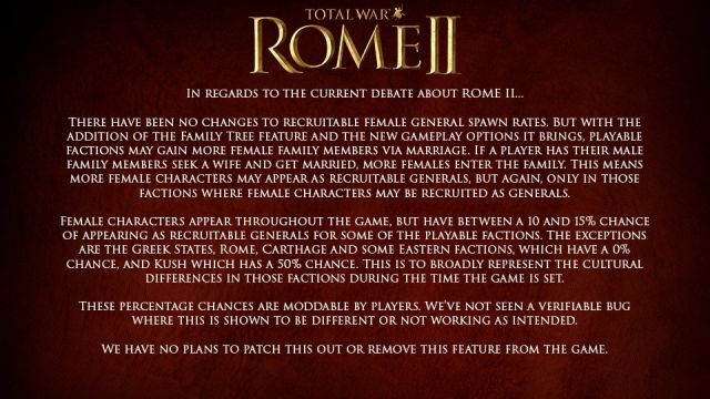 В официальном заявлении Creative Assembly отмечается, что авторы не меняли показатели вероятности появления женщин-генералов. Однако в игре ещё раньше появился элемент под названием «семейное древо», который добавил в игру новые возможности. В частности, члены семьи мужского пола могли жениться, в семье появлялись новые женщины, и это могло повысить число нанимаемых женщин-генералов. Это касалось только фракций, у которых могут быть женщины-генералы.