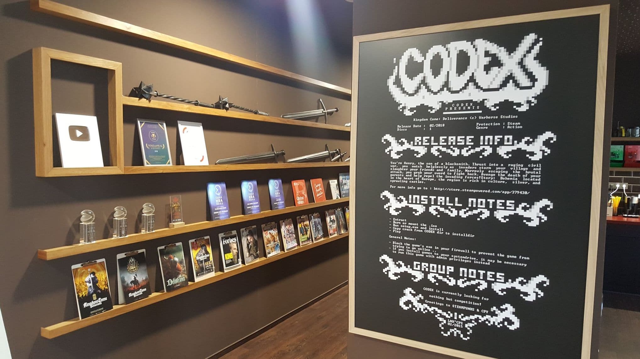 Оказывается, в офисе Warhorse Studious есть постер, на котором изображена информация о взломе РС-версии ролевой игры Kingdom Come: Deliverance. Подобные файлы с описанием игры и инструкцией по её установке прилагаются ко всем релизам хакерских групп.