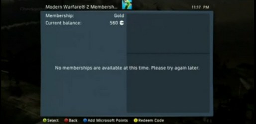 Описание ролика от его автора: «Я пытался подключиться к сетевой игре своего друга и увидел этот экран. Вверху было написано "Modern Warfare 2 Membersh...". Конечно же, последнее слово указывает на Membership. Там же присутствовала опция "Add Microsoft Points". Не знаю, что я сделал, чтобы вызвать это окно, однако после этого я его уже не видел».