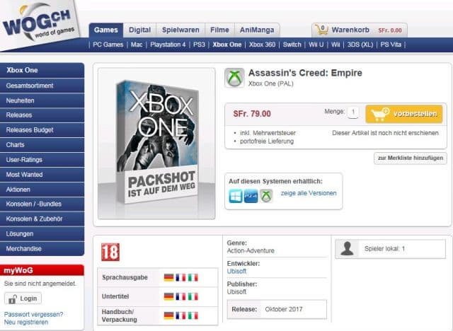 Если верить швейцарской торговой сети World of Games, то очередная часть серии Assassin’s Creed с подзаголовком Empire, поступит в продажу в октябре этого года. Основные части серии Assassin’s Creed выходили осенью. Компания Ubisoft пока официально не представило возвращение популярной франшизы.