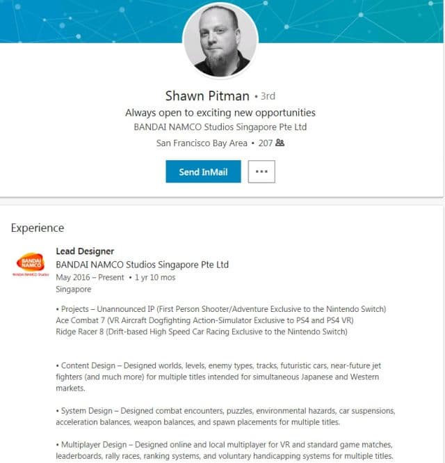 На странице Шона Питмана упоминается не анонсированный шутер от первого лица/приключение, который разрабатывается эксклюзивно для Switch. В сети появились предположения о том, что под «не анонсированным шутером/приключением» скрывается Metroid Prime 4. Ранее в сети мелькали слухи о том, что Bandai Namco занимается этим проектом совместно с Nintendo.