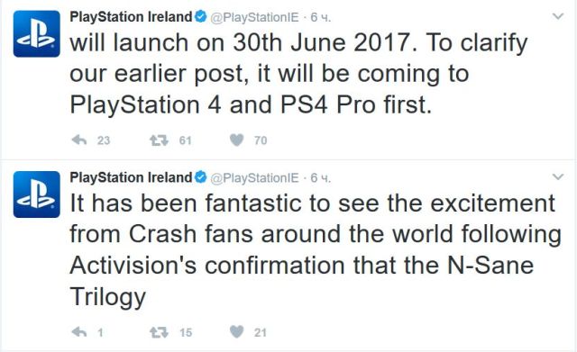 «Было приятно наблюдать за радостью фанатов Крэша по всему миру после того, как Activision подтвердила, что Crash Bandicoot N. Sane Trilogy появится в продаже 30 июня 2017 года. Мы также хотим уточнить один момент и сообщить, что игра изначально появится на PS4 и PS4 Pro», - говорится в сообщении. Ранее в твиттере появилось сообщение о том, что «Крэш возвращается на PlayStation».