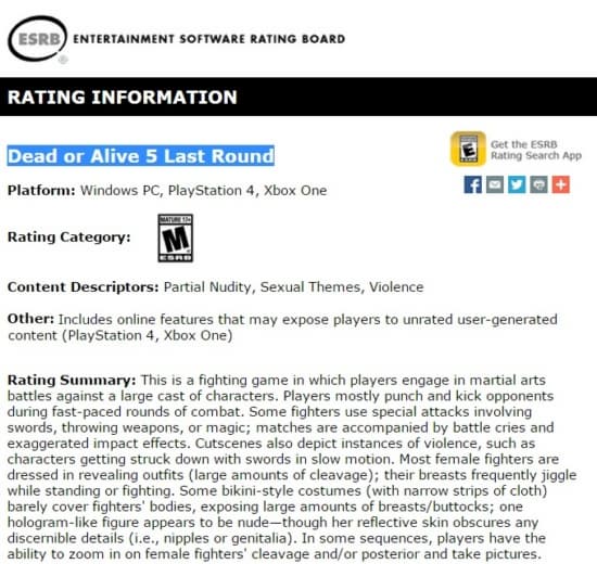 Затем упоминание Dead or Alive 5: Last Round для РС также появилось на сайте рейтинговой организации ESRB, однако Koei Tecmo пока что не спешит с официальным анонсом.