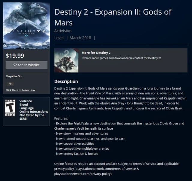 Японский, а затем и американский PlaystationStore нечаянно «слили» информацию о втором дополнении к онлайновому мультиплеерному шутеру Destiny 2. Оно будет называться Gods of the Mars (Боги Марса) и расскажет о противостоянии Стража и охотницы Аны Брэй искусственному интеллекту «Карл Великий» на холодной планете Марс. Герои окажутся на новой локации Frigid Vale в Хранилище «Карла Великого», где заточён «Распутин» - ещё один могущий ИИ, созданный во времена Золотого Века.