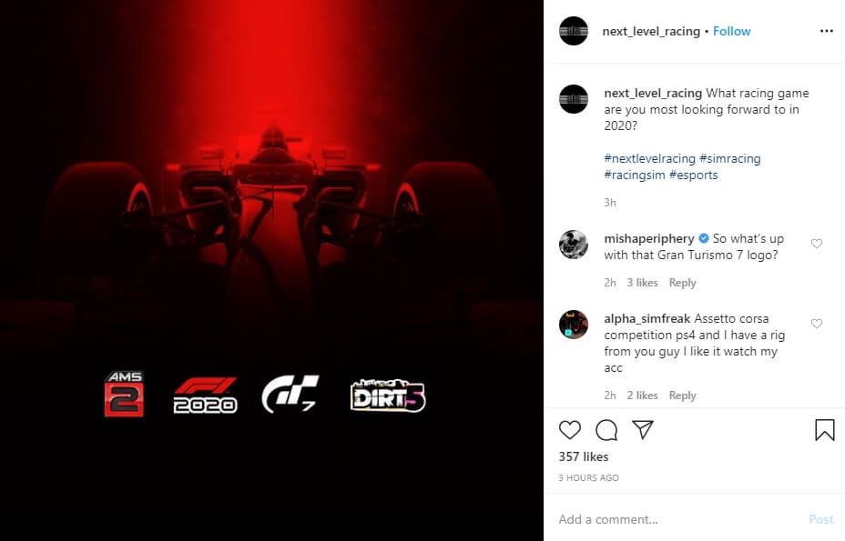 Компания Next Level, ответственная за профессиональные аксессуары и контроллеры для гоночных игр, опубликовала в Instagram многообещающее изображение. На картинке можно увидеть логотипы не только уже анонсированных проектов AMS 2, F1 2020 и Dirt 5, но и логотип Gran Turismo 7. К картинке прилагается вопрос: «В какую гоночную игру вы больше всего ждёте в этом году?» При этом Next Level является обладателем лицензии PlayStation.