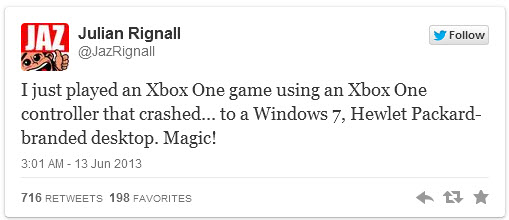 Джулиан Ригнал (Julian Rignall) из US Gamer оставил на своей twitter-страничке сообщение о том, что он играл в какую-то игру на стенде Xbox One при помощи нового контроллера, как неожиданно игра вылетела...на рабочий стол Windows 7.