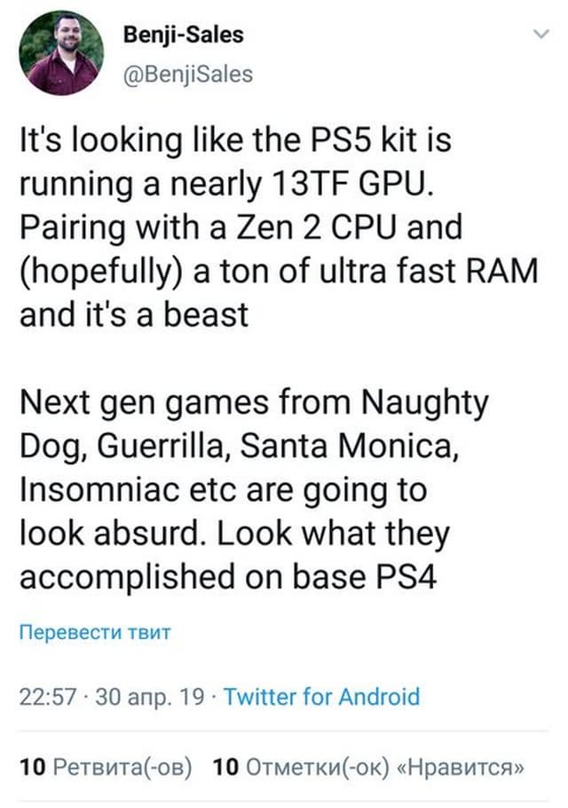 «Похоже, что графический процессор девкита PlayStation 5 демонстрирует производительность почти 13 терафлопс. В связке с процессором Zen 2 и внушительным объемом сверхбыстрой памяти это будет монстр. Игры следующего поколения от Naughty Dog, Guerilla, Santa Monica будут неприлично хороши. Посмотрите, чего они добились на PS4», - написал Benji-Sales.
