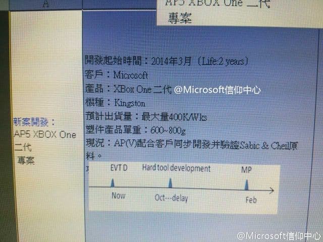 В сети появилось изображение с информацией о новой ревизии консоли Xbox One. В источнике говорится о «Xbox One II». Слухи о том, что Microsoft работает над дешёвой и более «тонкой» версией Xbox One появились ещё в 2014 году. Недавно на сайте Федерального агентства по связи США (Federal Communications Commission, FCC) была обнаружена информация о новой модели Xbox One.