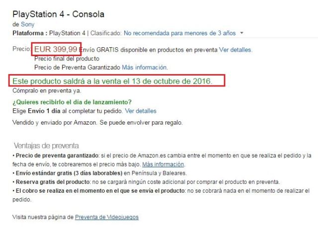 На официальном сайте испанского отделения торговой сети Amazon ненадолго появилась страница с указанием цены и даты выхода более мощной версии консоли PS4. Согласно уже удалённой информации, новая версия PS4 поступит в продажу в Европе 13 октября этого года по цене 400 евро. Что интересно, в этот же день, 13 октября, официально стартуют продажи шлема виртуальной реальности PSVR.