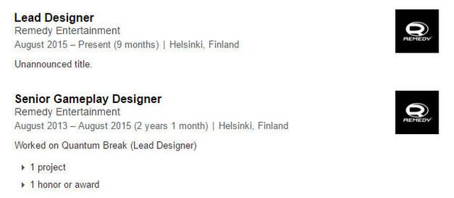 Есть основания полагать, что финская студия Remedy Entertainment уже работает над своей новой игрой. В сети LinkedIn в профиле одного из сотрудников студии указано, что он работает над не анонсированным проектом с августа прошлого года на должности ведущего дизайнера. Ещё один сотрудник Remedy Entertainment является исполнительным продюсером неизвестной игры.
