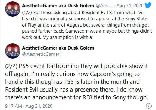 Dusk Golem считает, что следующая демонстрация Resident Evil Village состоится на очередной презентации, посвящённой PlayStation 5. Якобы анонс, связанный с Resident Evil Village, имеет непосредственное отношение к Sony. При этом в сентябре пройдёт выставка Tokyo Game Show, на которой Capcom обычно показывает Resident Evil. Информатор отметил, что ему «интересно, как Capcom разберётся со сложившейся ситуацией».