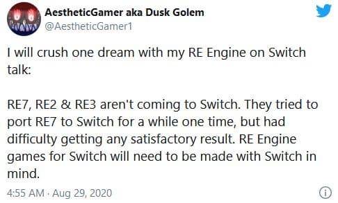Кроме того, Dusk Golem заявил, что ремейки Resident Evil 2 и 3, а также Resident Evil 7 не появятся на Switch. По слухам, разработчики не смогли добиться удовлетворительных результатов и столкнулись с трудностями при портировании Resident Evil 7 на Switch. Во все трёх проектах используется движок RE Engine.