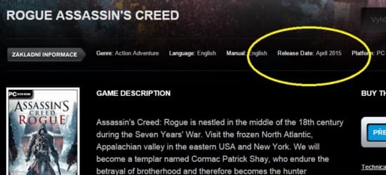 Согласно информации, указанной на сайте чешского онлайнового магазина Playman, Assassin’s Creed: Rogue появится на РС в апреле этого года.