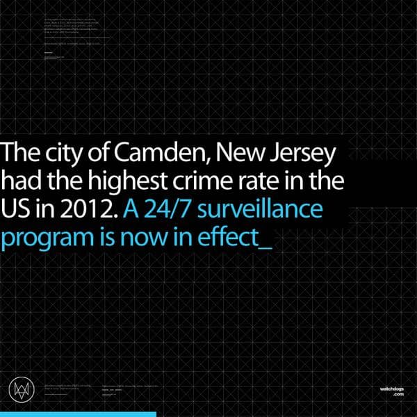 Кроме того, на официальной twitter-страничке Watch Dogs была опубликована следующая картинка, на которой говорится о том, что в городе Камден (штат Нью-Джерси) в 2012 году был зафиксирован самый высокий уровень преступности.