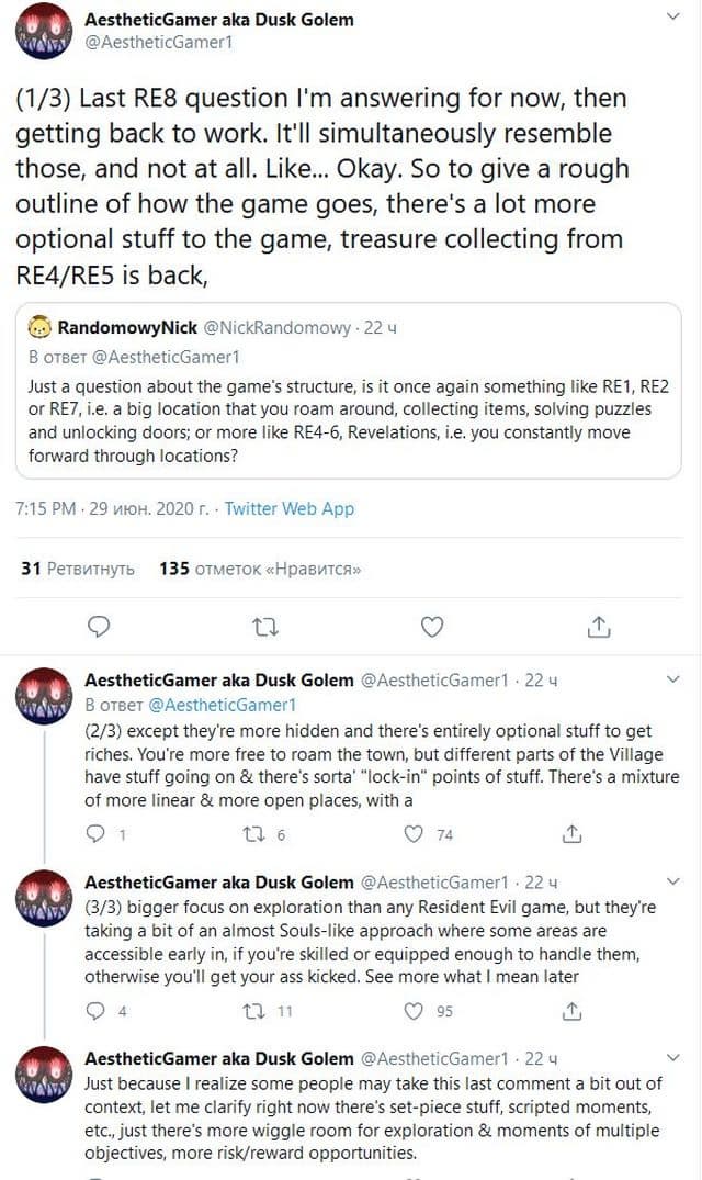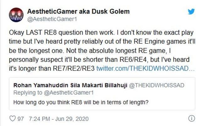 Dusk Golem полагает, что Resident Evil Village будет более продолжительной, чем RE7/RE2/RE3, но менее продолжительной, чем RE6/RE4.