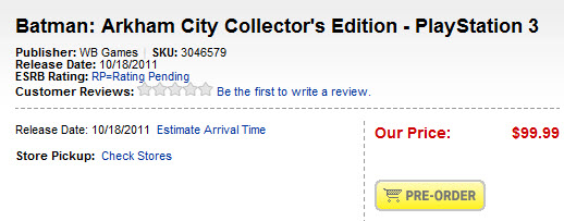 Коллекционное издание будет предлагаться по цене $99,99, релиз Batman: Arkham City ожидается 18 октября 2011.