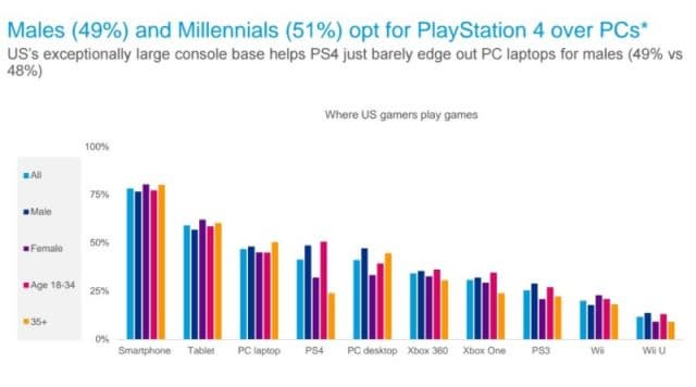 Компания PayPal (крупнейшая электронная платёжная система) и аналитическая компания SuperData Research провели исследование, согласно которому около 78% американских игроков играют на смартфонах. Около 48% игроков-мужчин из США играют на РС, а 49% - на PlayStation 4.