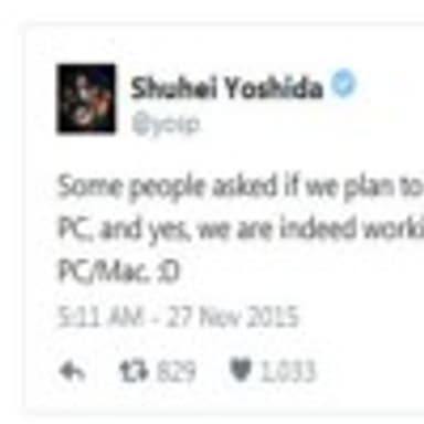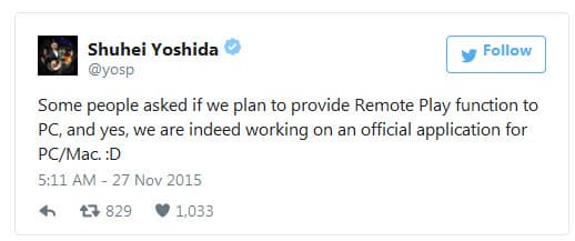 Президент Sony Computer Entertainment Worldwide Studios Сюхей Ёсида (Shuhei Yoshida), как обычно, выбрал для этого Twitter: «Нас спрашивают, планируем ли мы позволить транслировать игры с PS4 на РС. Да, мы работаем над официальным приложением, которое позволит вам транслировать игры на РС и Mac».