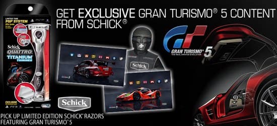 В PlayStation Blog компания Sony сообщила о подписании соглашения с компанией Schick на проведение совместной рекламной кампании Gran Turismo 5. Покупатели бритвы Quattro Titanium Trimmer получат в подарок следующий эксклюзивный контент: