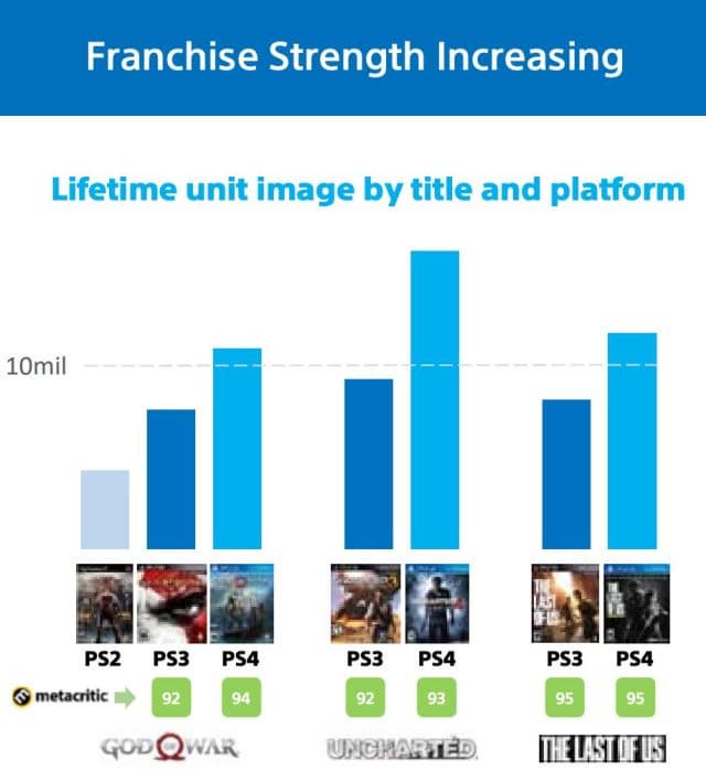 Sony также высоко оценивает теплый прием указанных игр отраслевыми СМИ. Согласно информации портала Metacritic, Uncharted 4: A Thief's End и God of War получили более высокий средний рейтинг, чем игры серий, выпущенные на PS3.