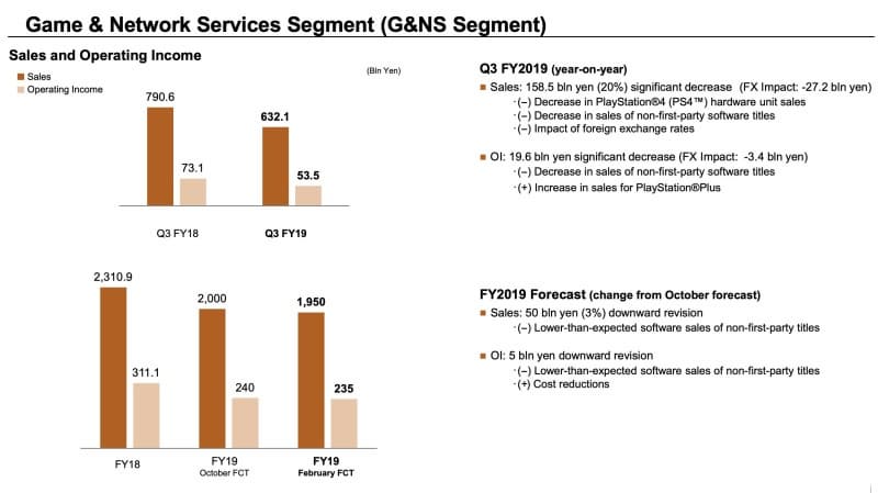 Доходы Sony от игр и сетевых сервисов составили $5,82 млрд., что на 20% меньше, чем за аналогичный период прошлого года. Более низкие результаты обусловлены снижением продаж устройств, игр от сторонних компаний и влиянием курсов валют. Японская корпорация также зафиксировала снижение дохода ($493 млн. после $673,7 млн.) на $180,7 млн.