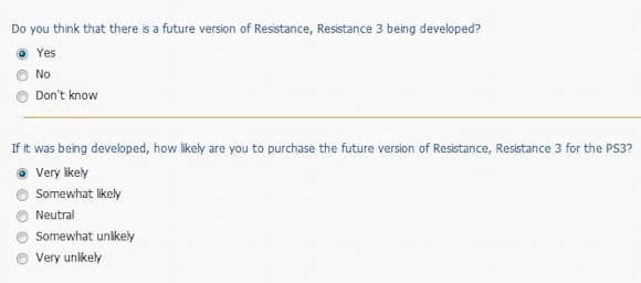 Как сообщает Joystiq, компания Sony провела опрос, в котором присутствовало несколько интересных вопросов, в частности, касающихся шутера от первого лица Resistance 3.