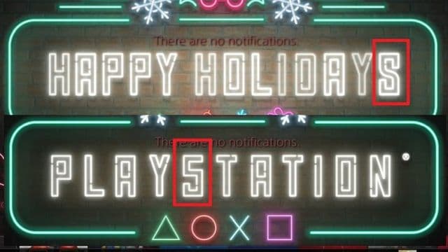 Казалось бы, обычная новогодняя тема – мягкая музыка, огни неоновых ламп, ёлка, подарок, снежинка и надпись «HAPPY HOLIDAYS» сменяемая на «PLAY5TATION». В слове HOLIDAYS видна буква S, а в слове PLAY5TATION - цифра 5. Причём шрифт у двух слов один.