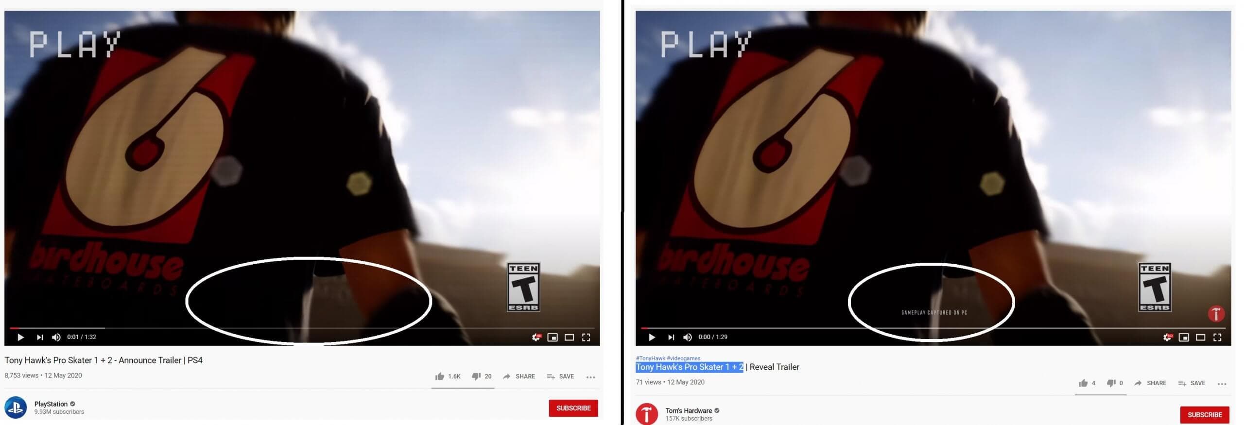 В сети появился дебютный трейлер ремастера Tony Hawk's Pro Skater 1 + 2, как на сторонних YouTube-каналах, так и на официальном YouTube-канале PlayStation. В начале ролике есть пометка о том, что «игровой процесс записан на РС». Однако в версии ролика на канале PlayStation упоминания о РС-версии нет вообще.
