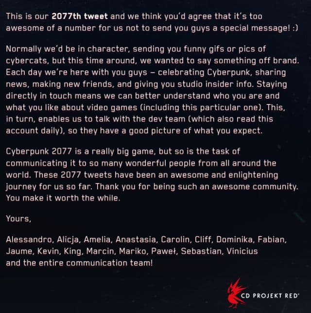 В официальном твиттер-аккаунте Cyberpunk 2077 появилось 2077-е сообщение, в котором сотрудники CD Projekt Red, отвечающие за наполнение аккаунта, поблагодарили пользователей за поддержку.