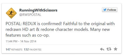 Разработчики из студии Running with Scissors на своей twitter-страничке официально сообщили о том, что они занимаются созданием ремейка оригинальной игры, который получит название Postal: Redux.