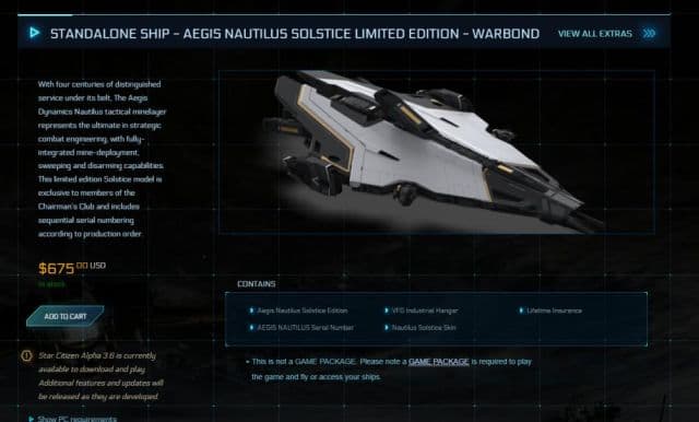 Во время встречи был показан эксклюзивный внутриигровой корабль Aegis Nautilus Solstice стоимостью $675, доступный лишь членам Chairman’s Club. О времени появления корабля в альфа-версии игры не сообщается, но он уже доступен для покупки.