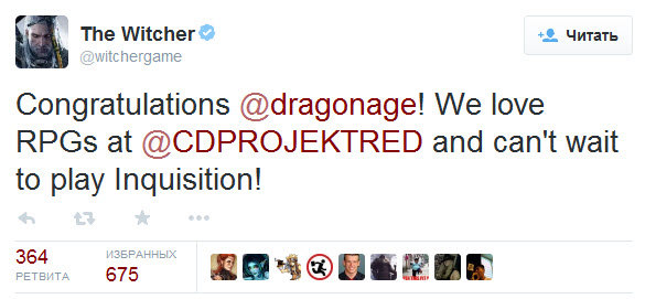 Вчера одновременно с американским релиз ролевой игры Dragon Age: Inquisition на twitter-страничке создателей The Witcher было опубликовано поздравление в адрес BioWare.