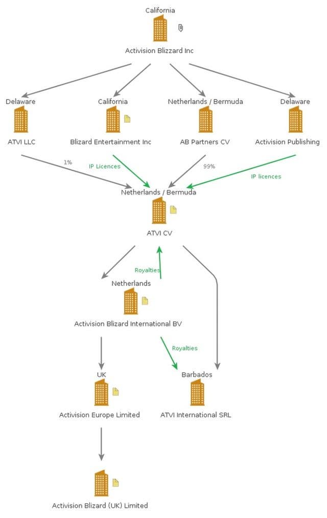 - Подразделения компания Activision Blizzard в США продают права интеллектуальной собственности голландскому партнёру ATVI CV, являющемуся резидентом Бермудских островов. У ATVI CV есть также дочерняя компания ATVI International SRL в Барбадосе.