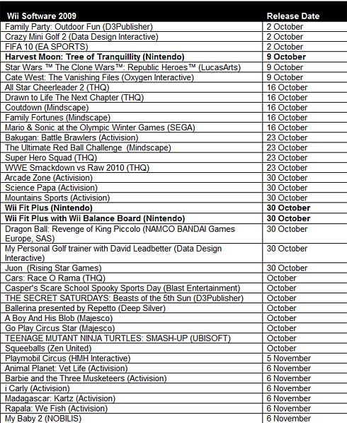Например, игра The Legend of Zelda: Spirit Tracks для DS появится на прилавках магазинов 11 декабря этого года, Wii Fit Plus - 30 октября, New Super Mario Bros. Wii - 20 ноября.
