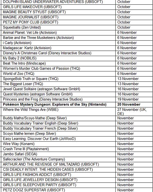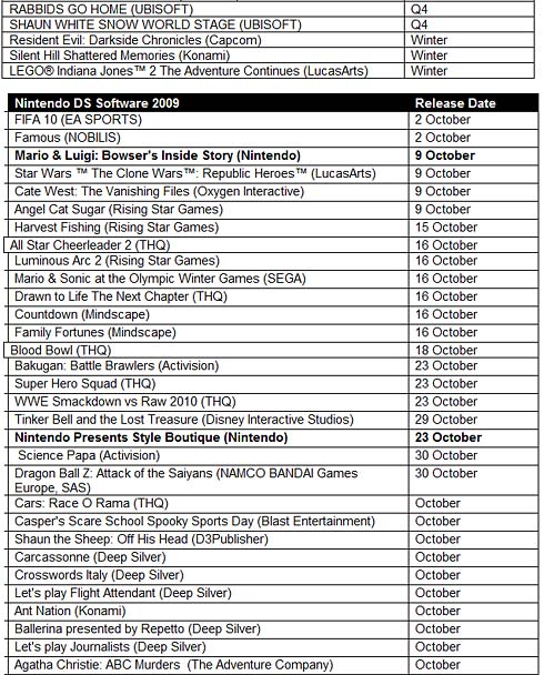 Подразделение Nintendo UK опубликовала список игры для консолей Wii и DS, которые должны поступить в продажу на территории Соединенного Королевства и всего европейского региона до конца этого года, указав точные или ориентировочные даты.