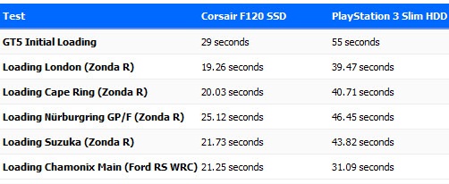 Пользователь форумов Beyond3D под ником Phil именно так и сделал, произведя различные тесты и замеры. Результаты таковы - при использовании твердотельного накопителя с игрой Gran Turismo 5 время загрузки в некоторых случаях сокращается наполовину. Во всех тестах заметно существенное улучшение ситуации.