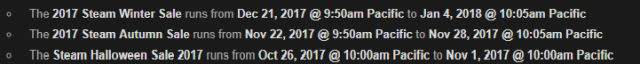 Практически всегда перед большими распродажами в Steam кто-нибудь из разработчиков обязательно сбрасывает приватную информацию для компаний в сеть. Так случилось и на этот раз. Даты проведения распродаж изначально появились на форуме Reddit, а потом и на крупных порталах, включая Eurogamer.