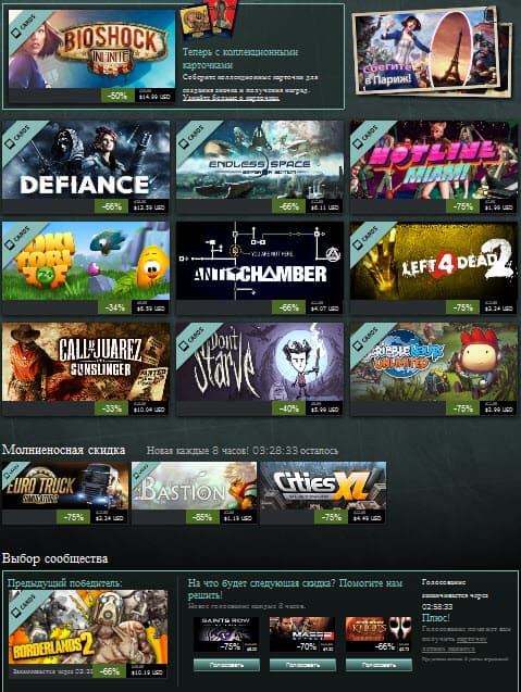 В данный момент вы можете приобрести по привлекательным ценам Bioshock Infinite, Borderlands 2 и другие игры. С некоторыми играми вы можете получить коллекционные карточки Steam — это виртуальные карточки, которые выпадают во время игры в Steam. Наборы карт могут быть превращены в игровые значки и обмениваемые предметы сообщества Steam.